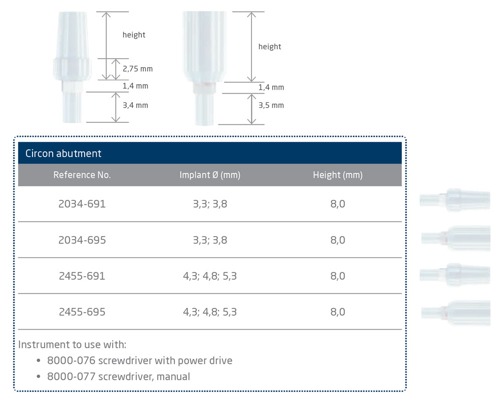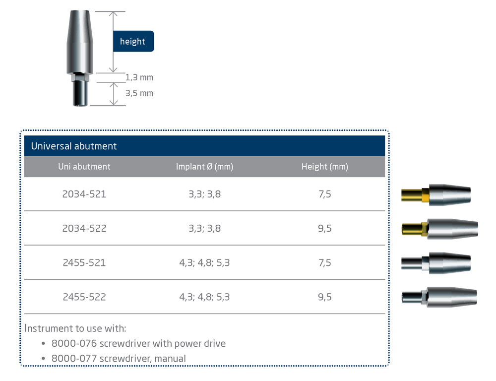 The cylindrical abutment is recommended whenever there is a need to correct axial deviations in case any implants are not adequately parallel with each other. It can be used for the preparation of both individual crowns and bridge and can be corrected by means of milling whenever necessary.
