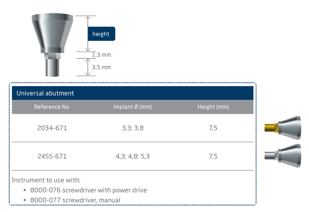 The conical, universal abutments can be used for the preparation of both individual crowns and bridges.