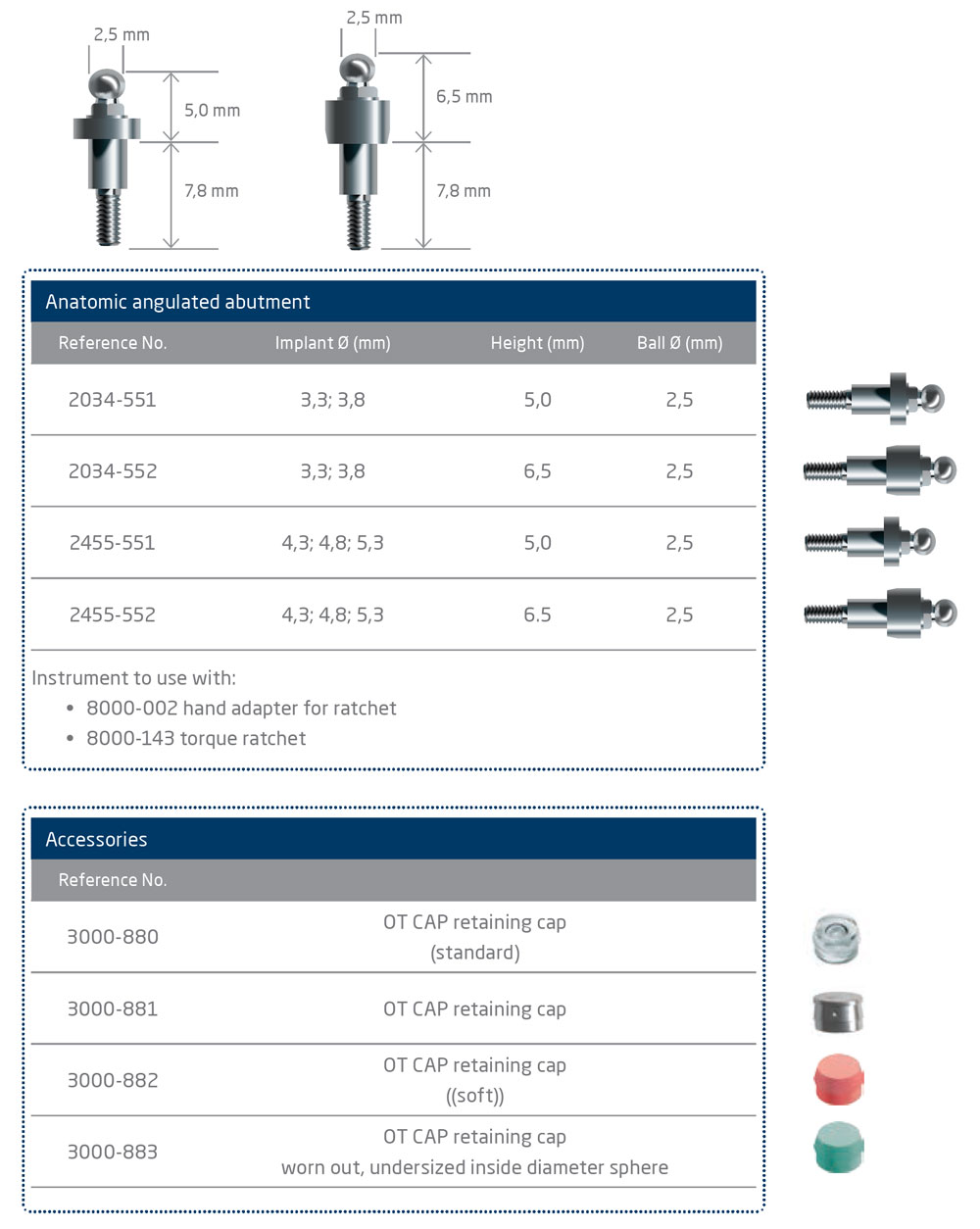 The ball abutments are available in 2 heights. The ball abutment is made of titanium alloy TiAlV. The radius of the ball is 2 mm.