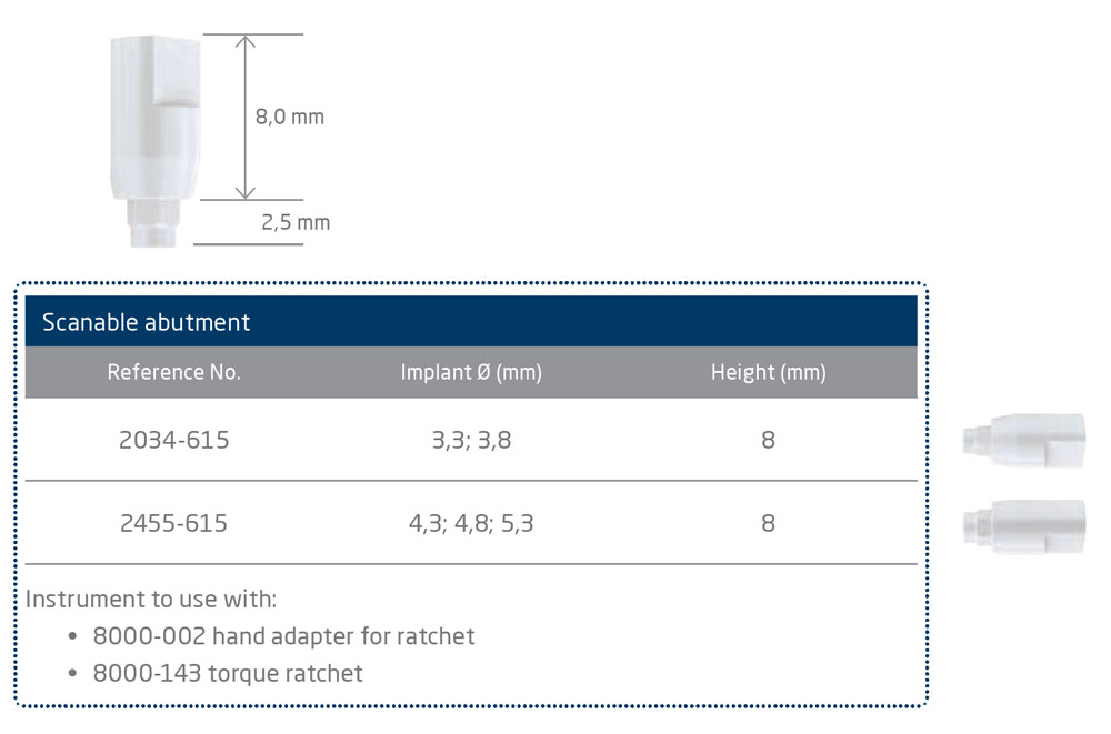Due to the material of the temporary abutment (WHITE PEEK), it can be applied to dental scanners. For the construction of immediate, temporary prostheses, we recommend the use of temporary headpieces made of hard plastic (PEEK). The headpiece is secured to the implant with a through bolt. After securing the headpiece, it may be ground in, as necessary, with a turbine in the mouth, and the impression for the temporary immediate prosthesis can be taken immediately. The completed crown/bridge is fixed to the headpiece with adhesive cement. Immediate headpieces are not recommended for long-term loading.