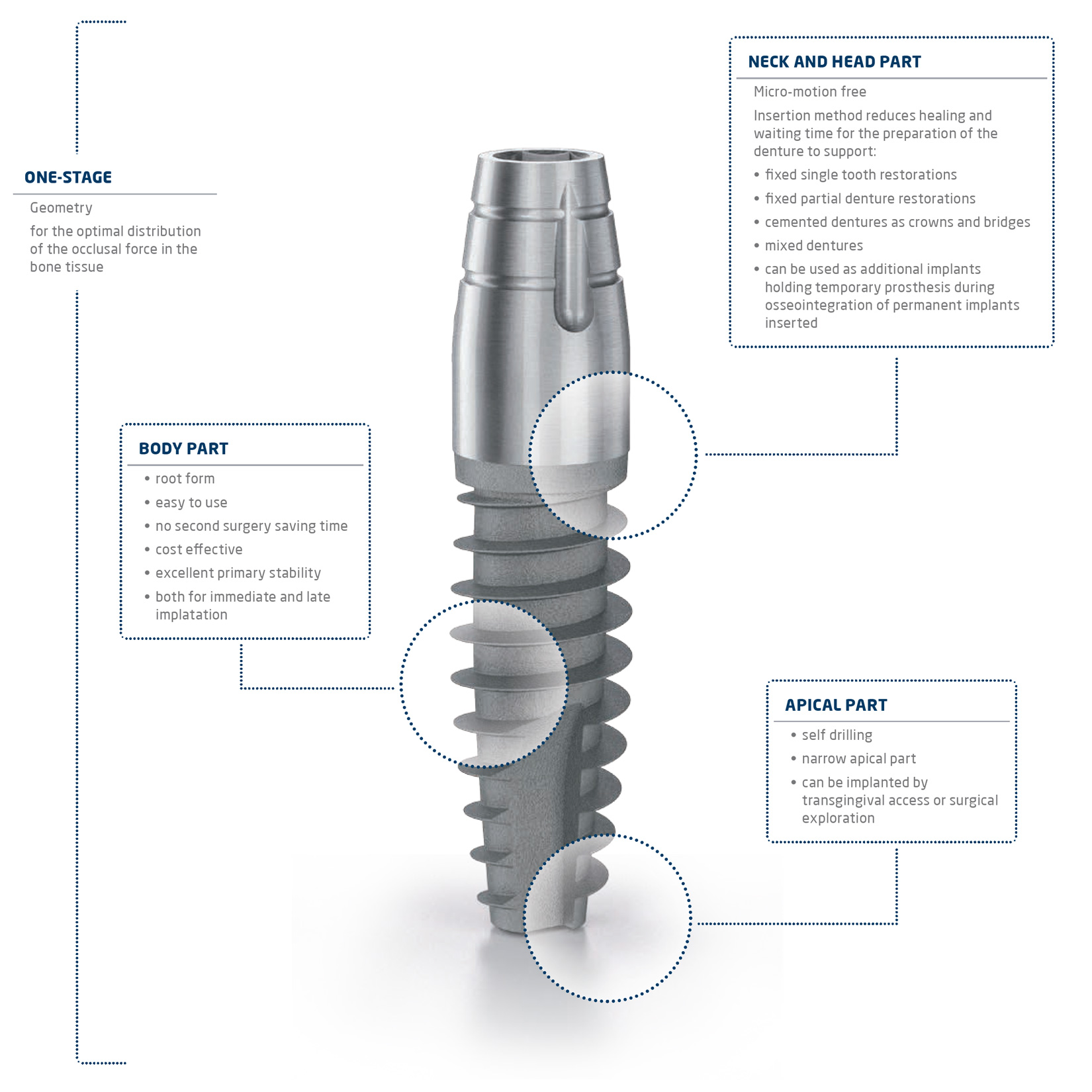 Its highly micro-porous surface ensures a stable implant-bone connection thus creating an optimál condition fór successful treatment. According to clinical control studies, the success rate of Denti® implants has been above 97% over the pást 27 years.