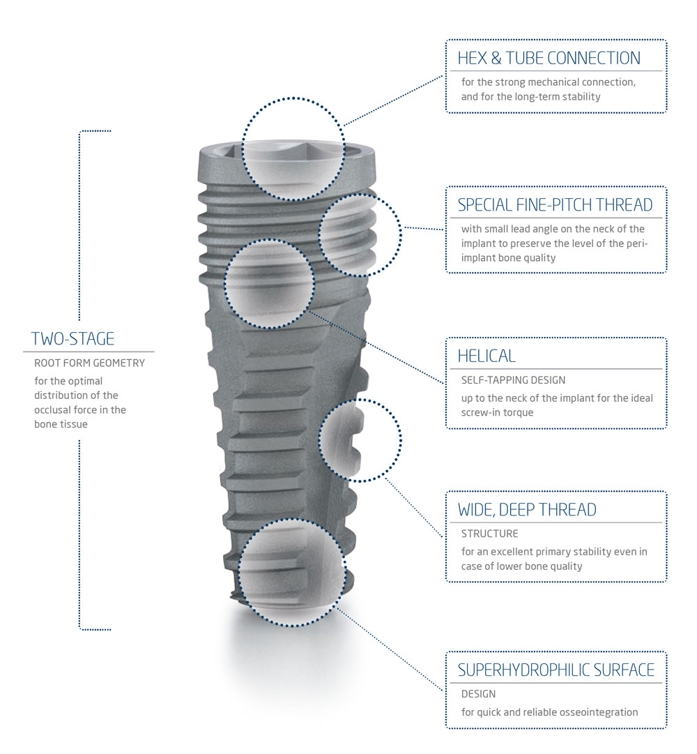 Its highly micro-porous surface ensures a stable implant-bone connection thus creating an optimál condition fór successful treatment. According to clinical control studies, the success rate of Denti® implants has been above 97% over the pást 27 years.